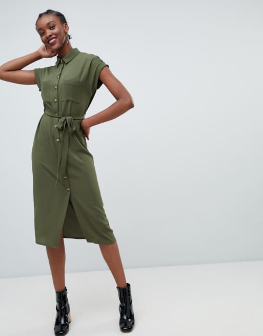 Button up waist midi shirt dress in soft khaki-Green. Floral frill collar long sleeve midi dress in green pattern. Discover new items daily.